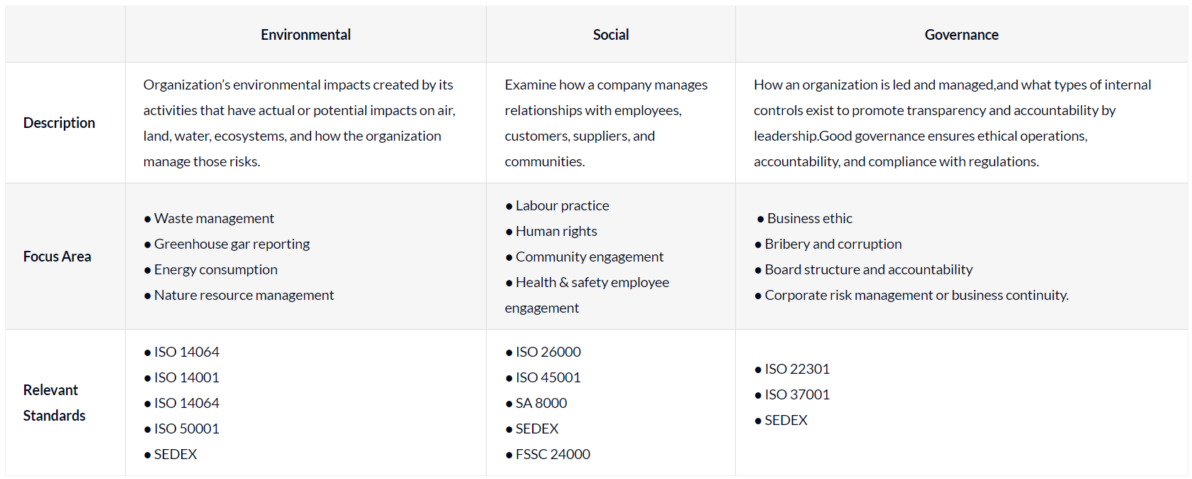 Description | Organization’s environmental impacts created by its activities that have actual or potential impacts on air, land, water, ecosystems, and how the organization manage those risks. | Examine how a company manages relationships with employees, customers, suppliers, and communities. | How an organization is led and managed,and what types of internal controls exist to promote transparency and accountability by leadership.Good governance ensures ethical operations, accountability, and compliance with regulations. |